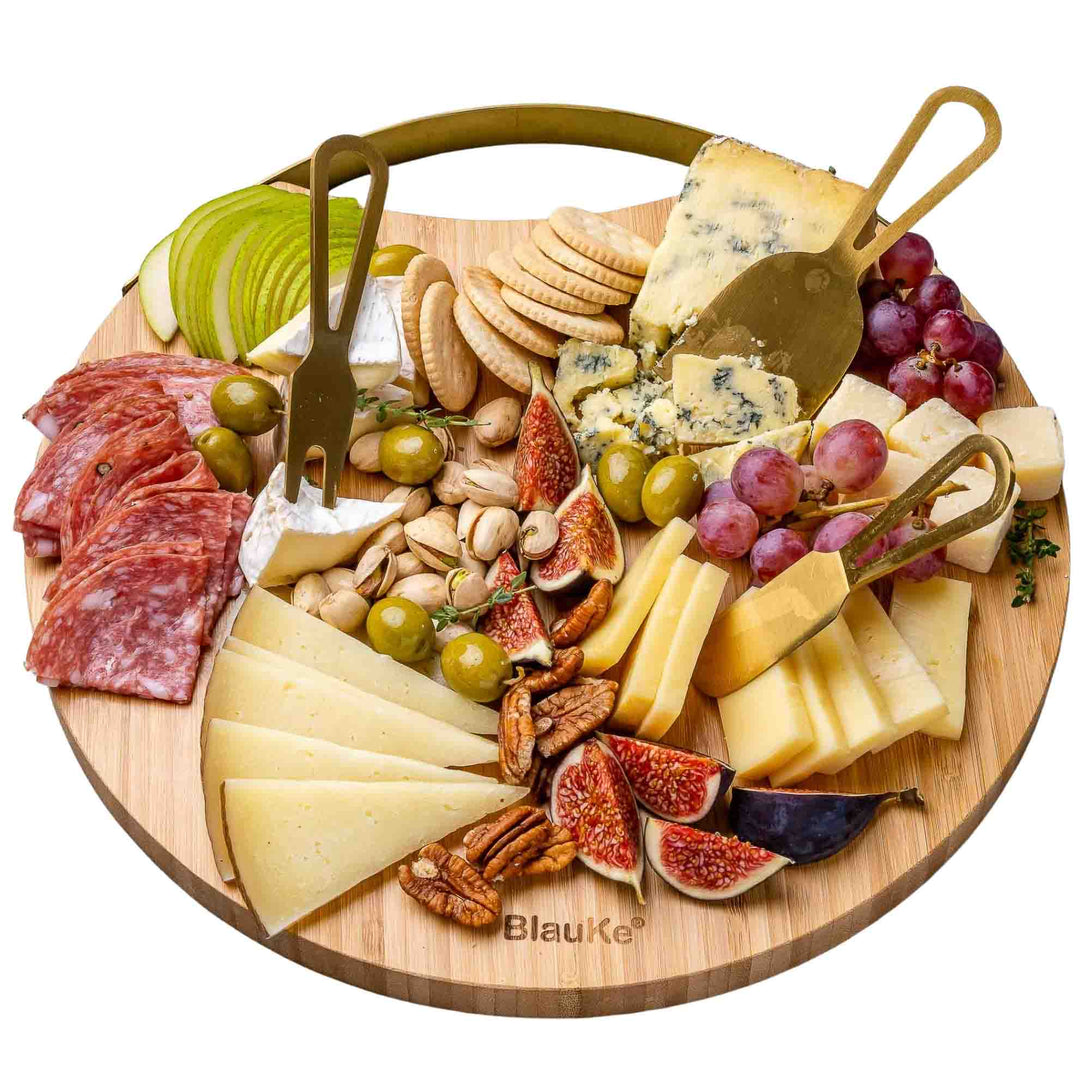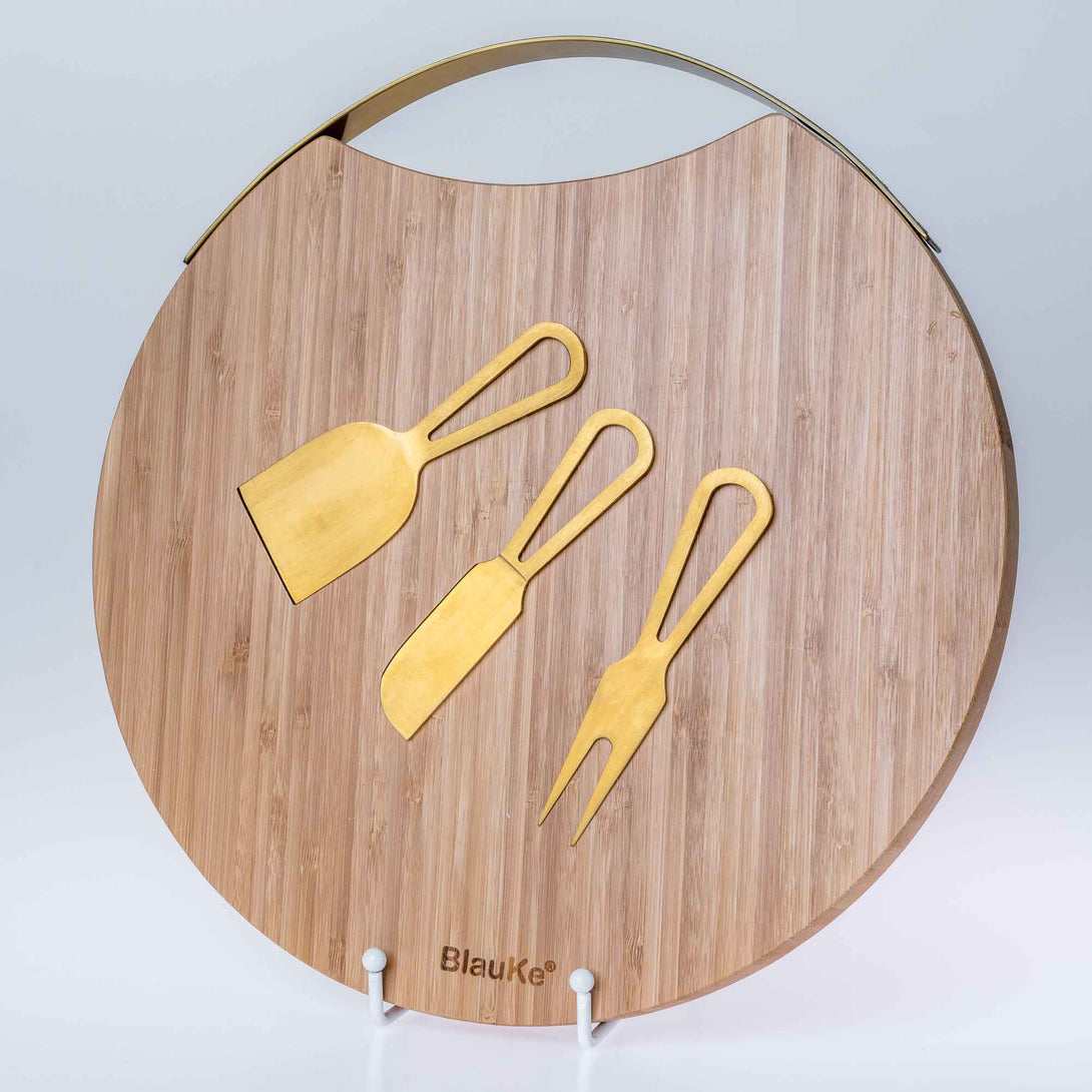 - This 13-inch Bamboo Cheese Board and Knife Set make a fancy presentation that your guests won’t soon forget. With internal magnets, it elegantly secures the cheese knives and tools.