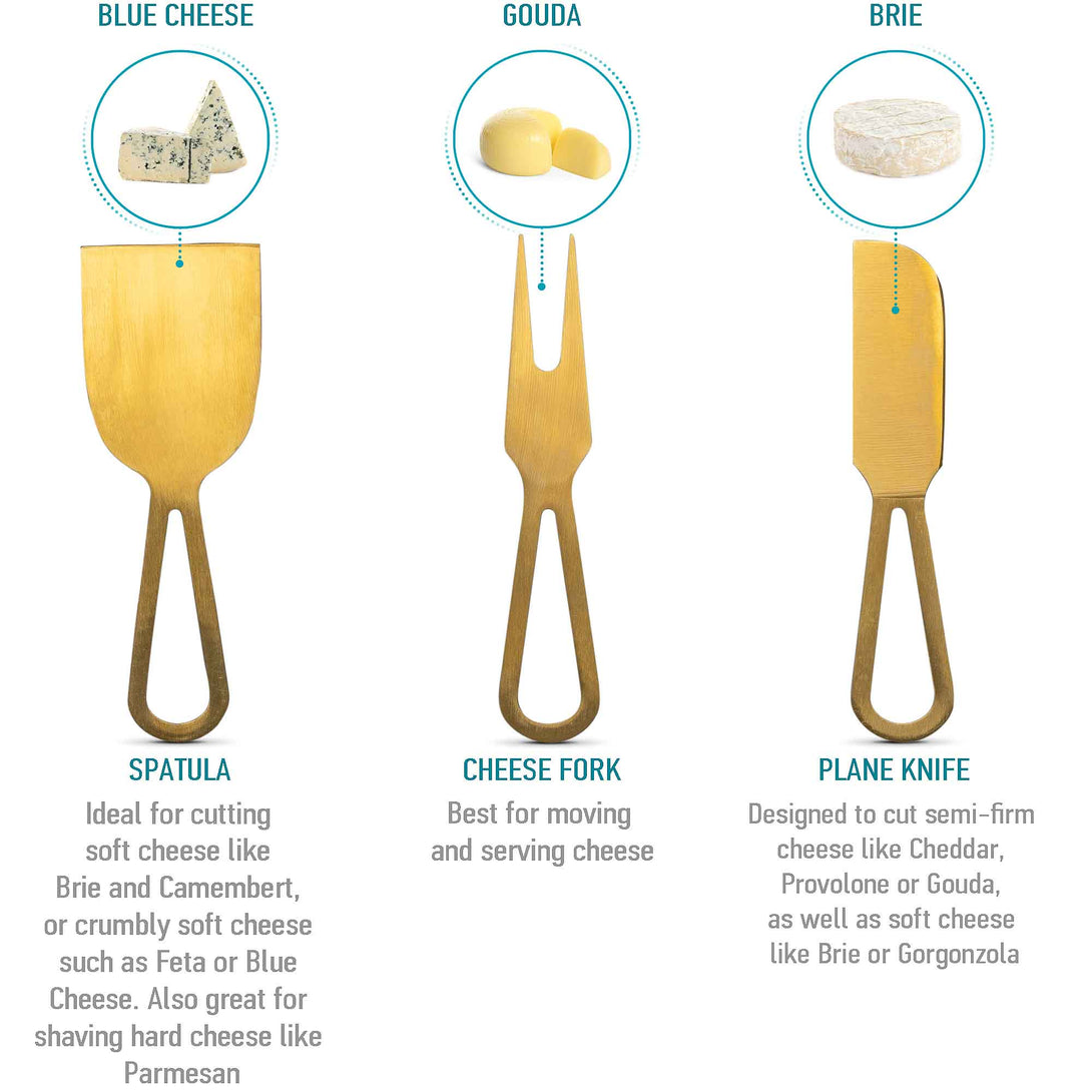 - Cheese knife set included: a spatula knife to slice or shave; a plane knife for firmer cheeses; and a serving fork.