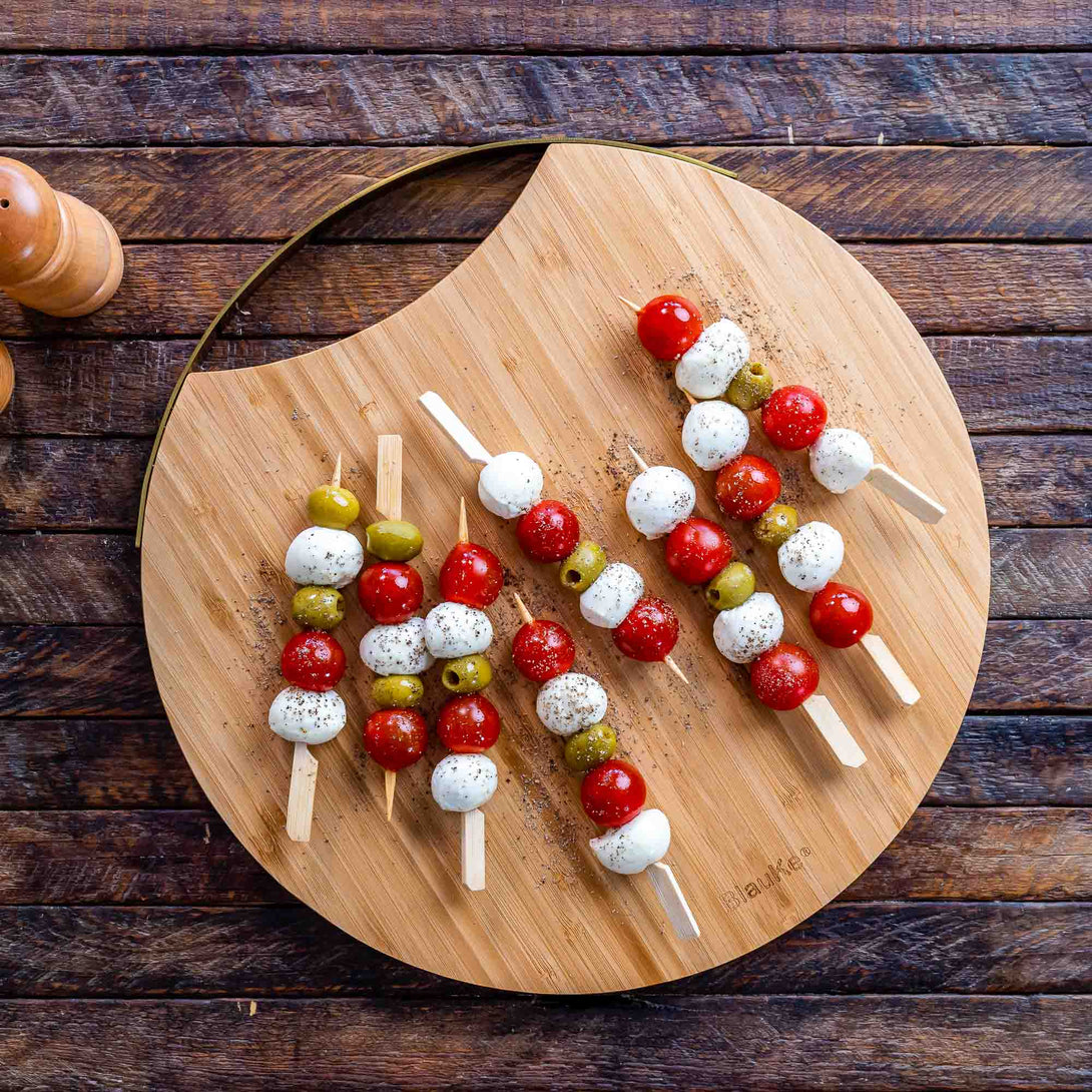 With a 13” (33 cm) diameter and just 0.8” (2 cm) thick, this sleek yet sizable bamboo board with magnetic storage is your go-to party serving platter. The included cutlery feels like a dream in your hand and sports a gold finish that perfectly complements the tray. All three pieces can be magnetically secured to the board, and a built-in handle allows you to easily carry the whole thing. A far cry from those big, bulky charcuterie boards, this is a simple, elegant way to serve your guests some scrumptious treats.